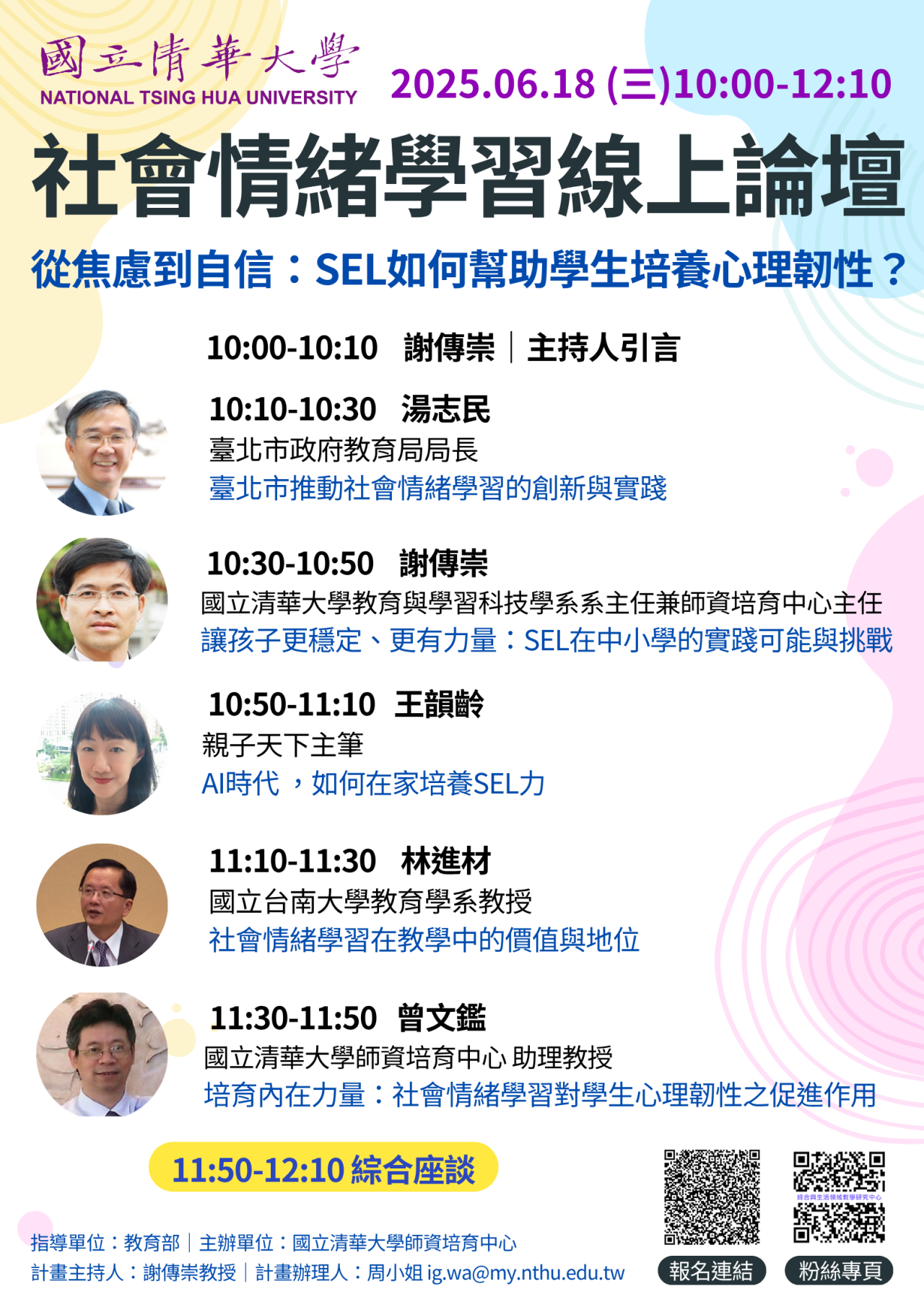 一、 清華大學師資培育中心舉辦之論壇為「社會情緒學習-從焦慮到自信:SEL如何幫助學生培養心理韌性?」,旨在探討如何透過系統性教學,培養學生的自我覺察、情緒管理、人際互動與責任決策能力。透過專家講座與實務交流,期能協助教師深化SEL理念與教學策略,進而促進學生全人發展,強化學校教育支持系統。