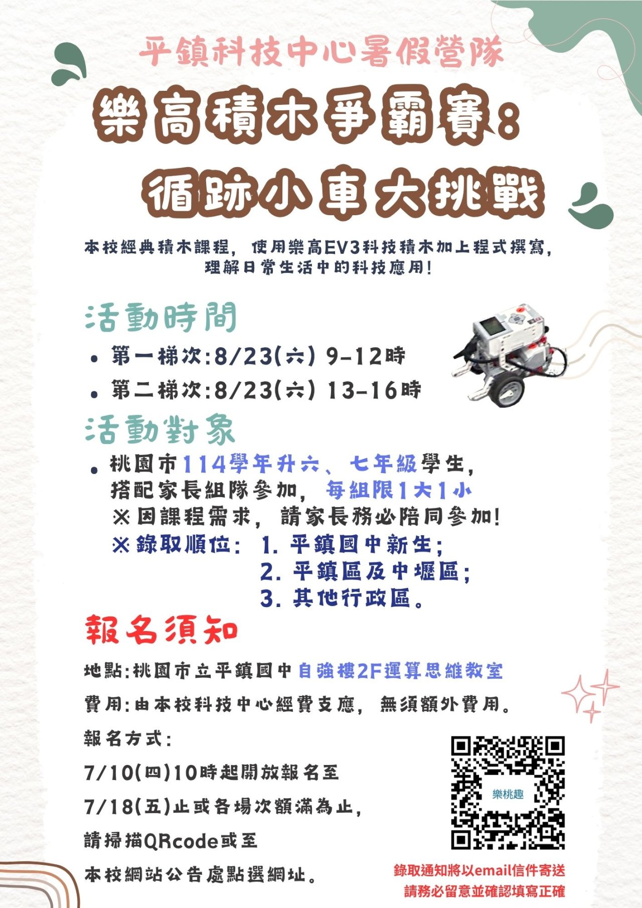 | 八、 | 活動須審核,報名成功非即錄取,本活動將於7/23(三)中午12時前,於平鎮國中官網與本中心粉絲專頁公告錄取名單,並同步寄送email至家長信箱。 |