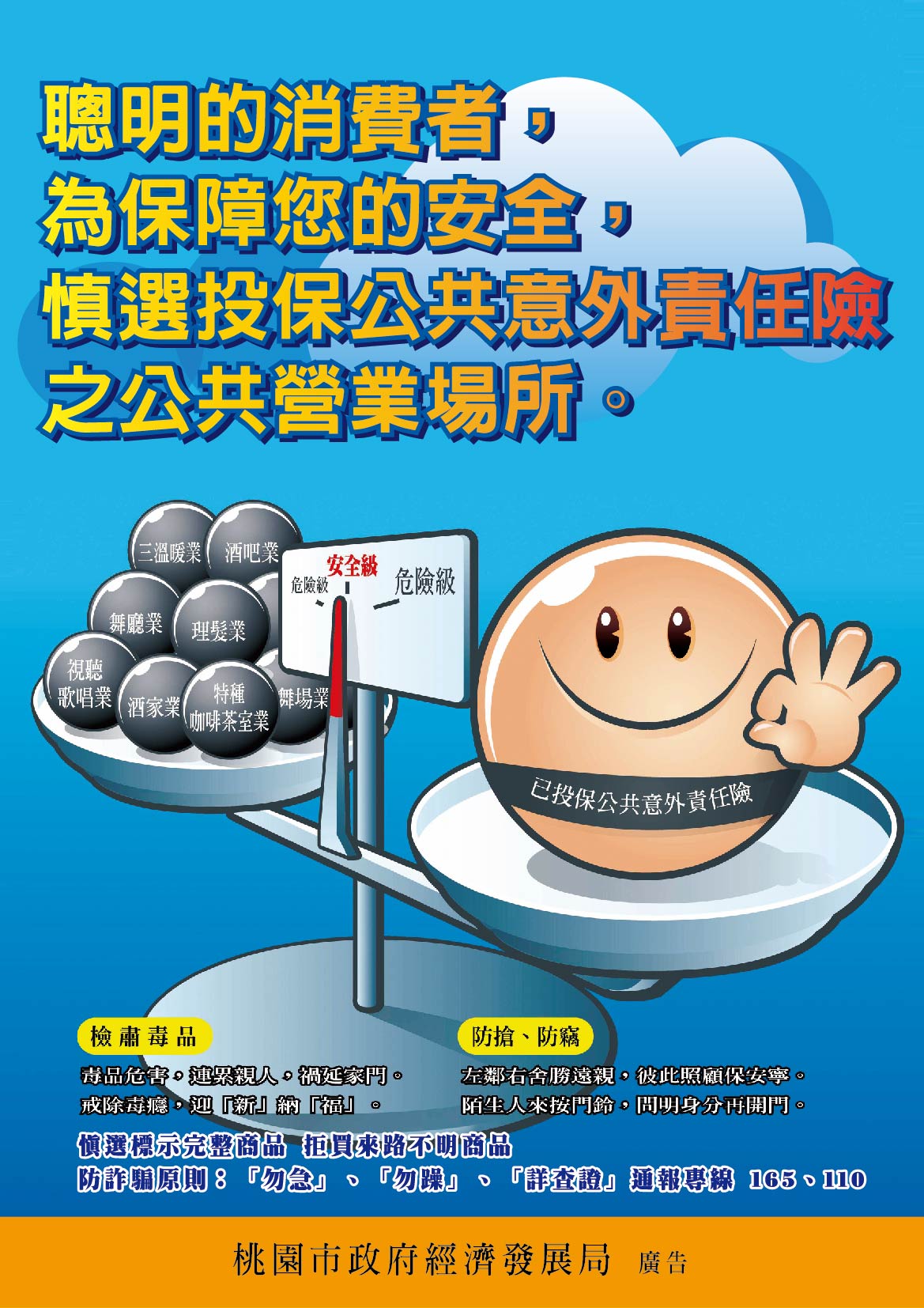 1、聰明的消費者,為保障您的安全,慎選投保公共意外責任險之公共營業場所。 2、提醒消費者拒絕購買來歷不明、標示不全的商品,以保障您的消費權益。 3、經營特定行業者,登記營業項目應包括特定行業種類,以免受罰。 4、經營資訊休閒業,登記營業項目應包括資訊休閒業,以免受罰。