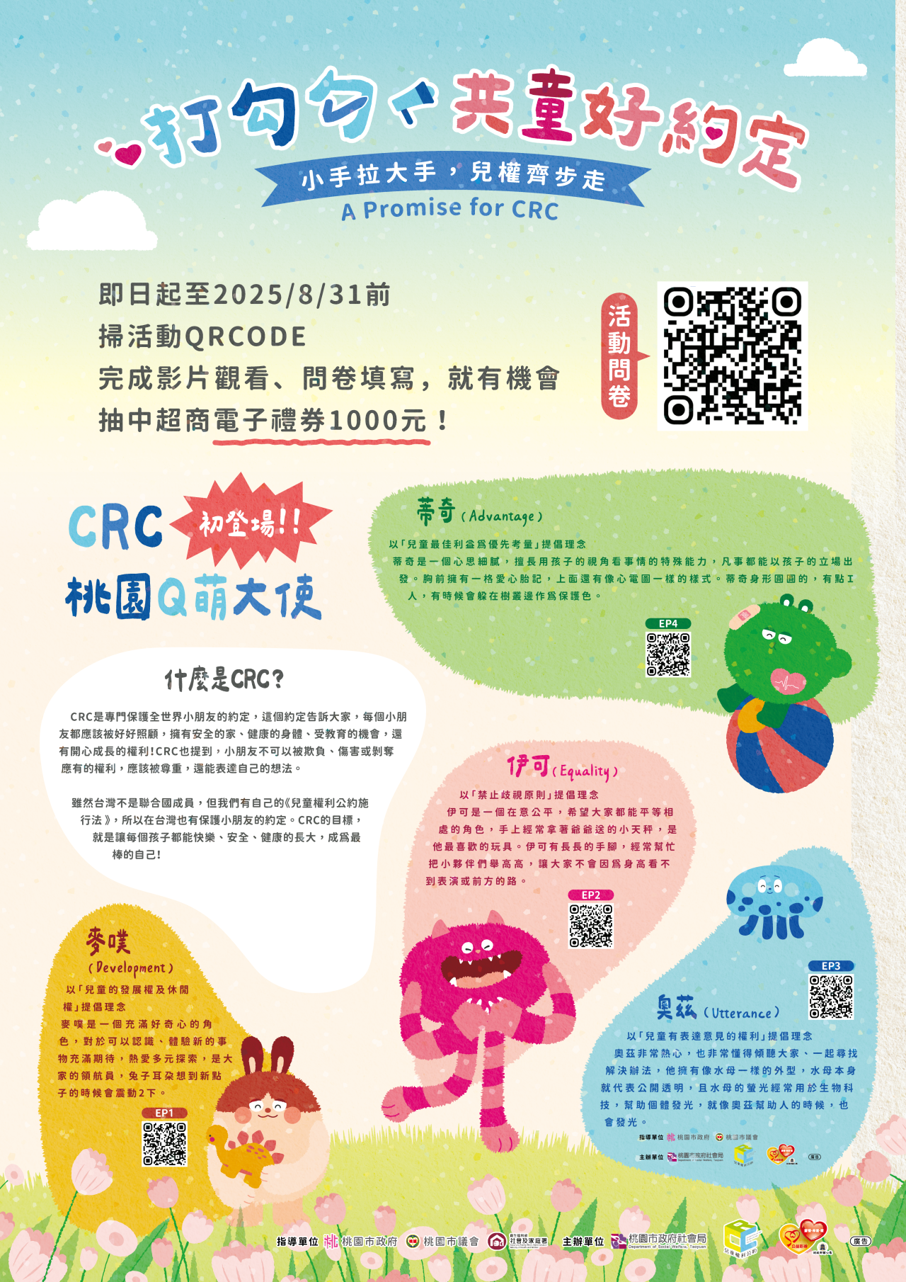 三、本府社會局於113年誕生4個「桃園Q萌大使」角色,宣導 CRC觀念,並完成4部講解以CRC四大原則為核心概念的動畫 影片。於本年度進行社區宣導活動,期待將動畫作為教材 推廣至本市市民,逐漸把CRC的精神融入生活當中。