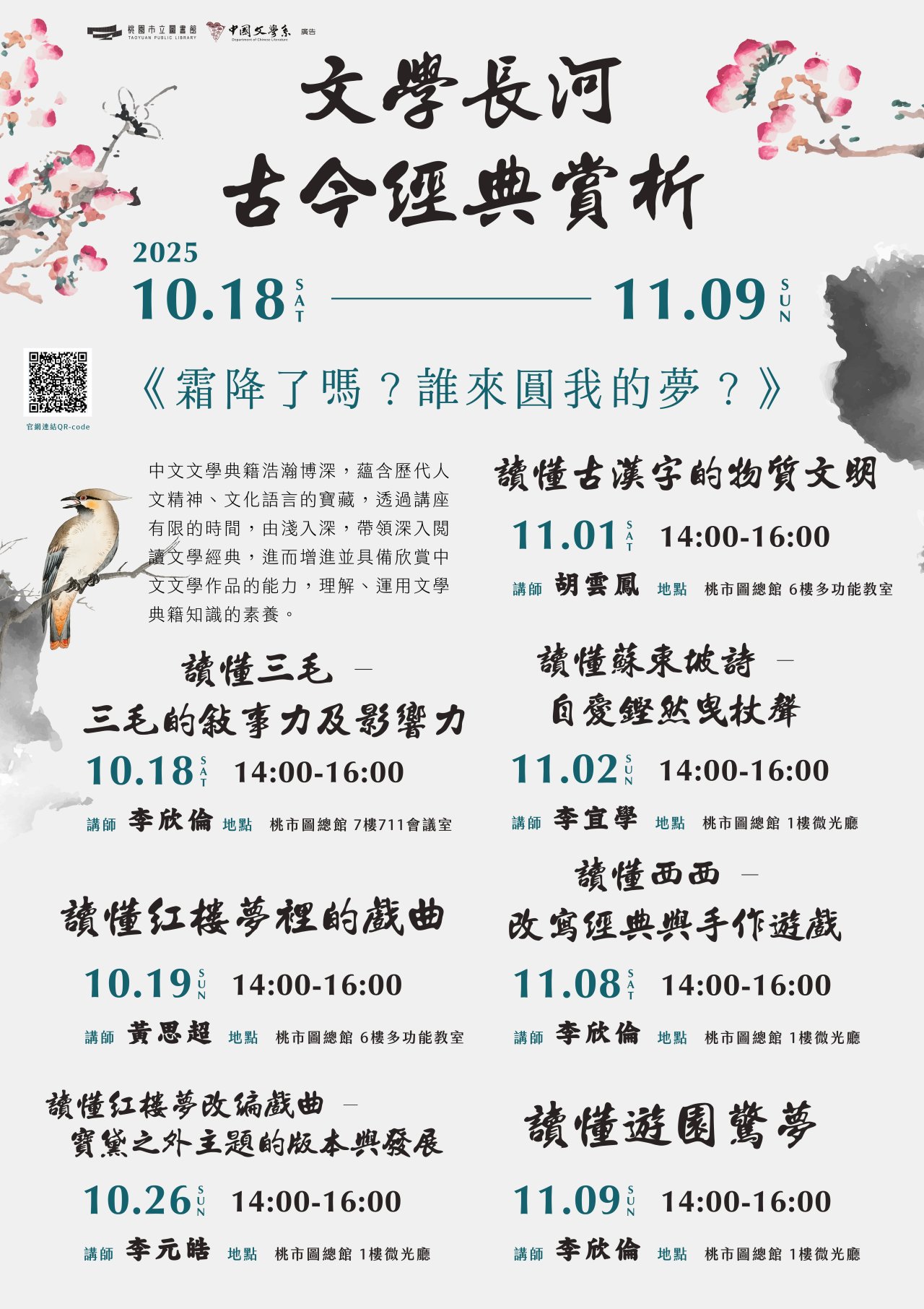轉知桃園市立圖書館辦理「文學長河 古今經典賞析」兩波講座,說明如下: