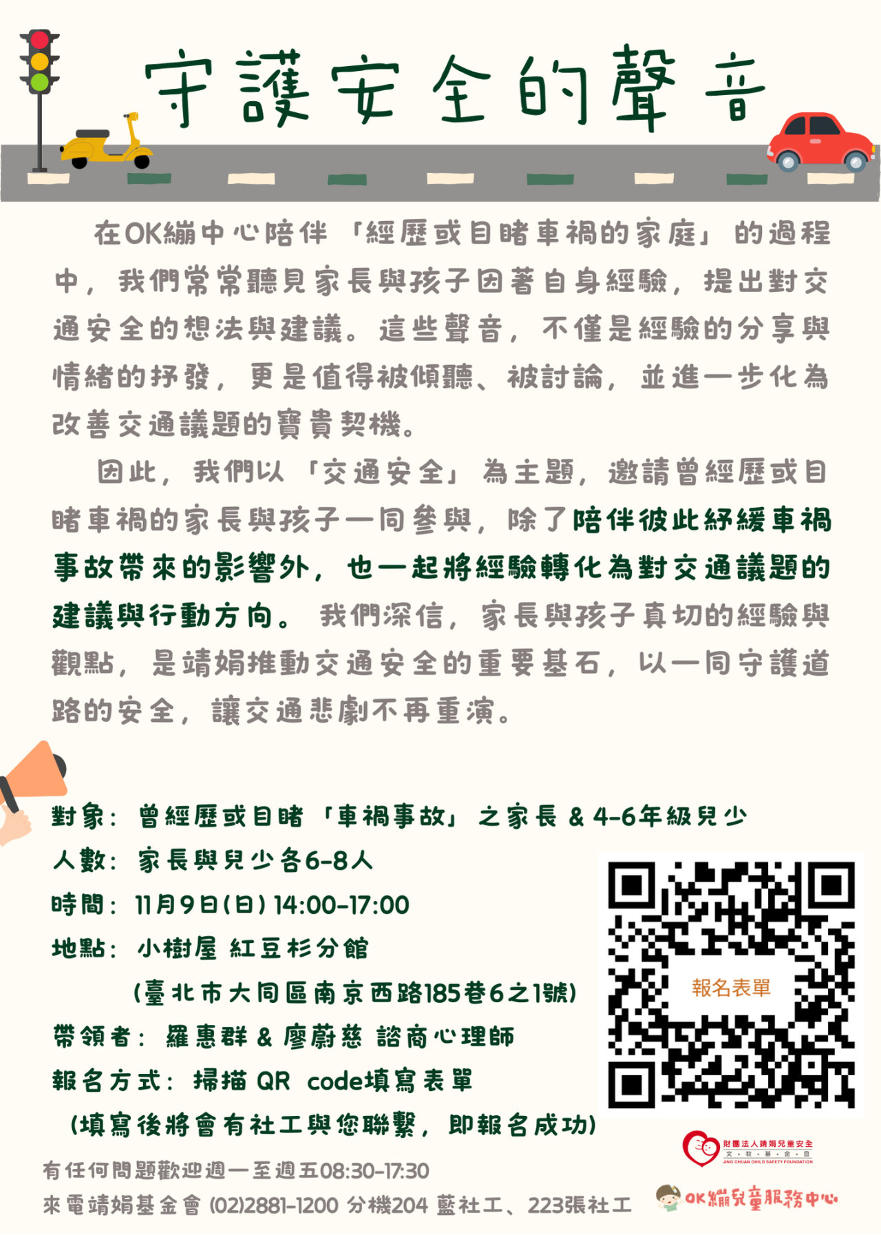 該會以「交通安全」為活動主題,邀請曾經歷或目睹車禍之家長及兒少共同參與,期協助家長及兒少紓緩事故影響之餘,並凝聚意見並討論交通環境的改善方向。