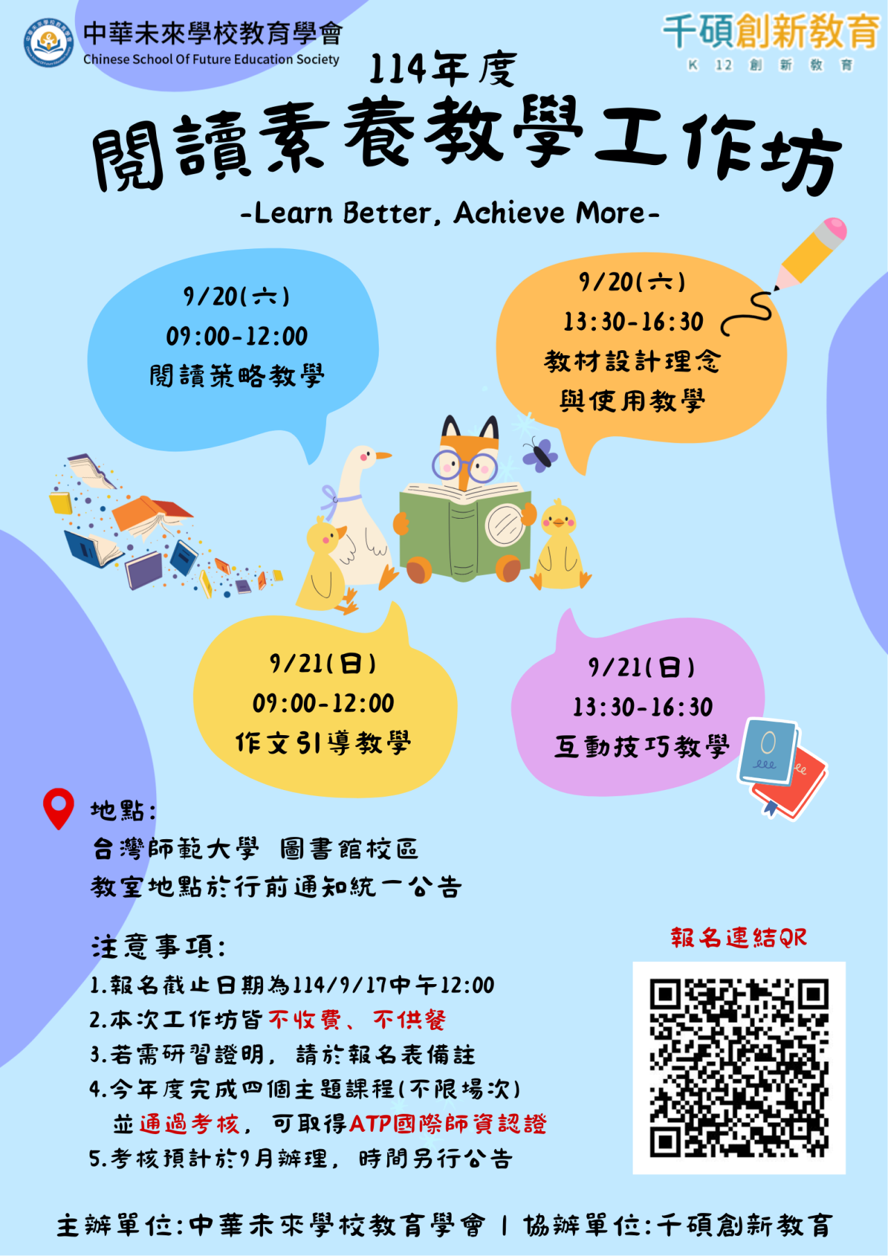 為增進教師素養導向教學知能,中華未來學校教育學會辦理「國際ATP素養導向閱讀教師研習工作坊」, 說明如下: