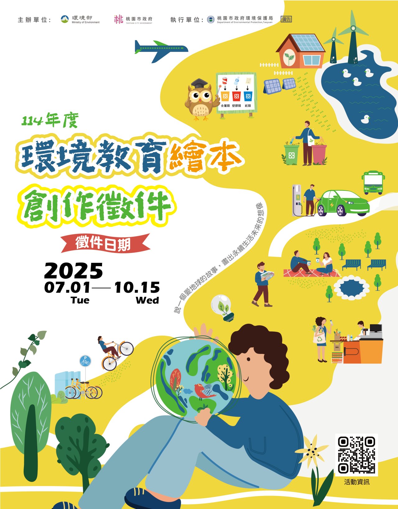 | 一、 | 為鼓勵社會大眾關注環境議題,發掘並訴說與環境相關的故事,特舉辦「114年度環境教育繪本創作徵件活動」,邀請民眾以環境故事或議題為背景,自由發想創作繪本。創作形式不拘,可為真人真事、擬人化手法,或任何具創意的表現方式。 |