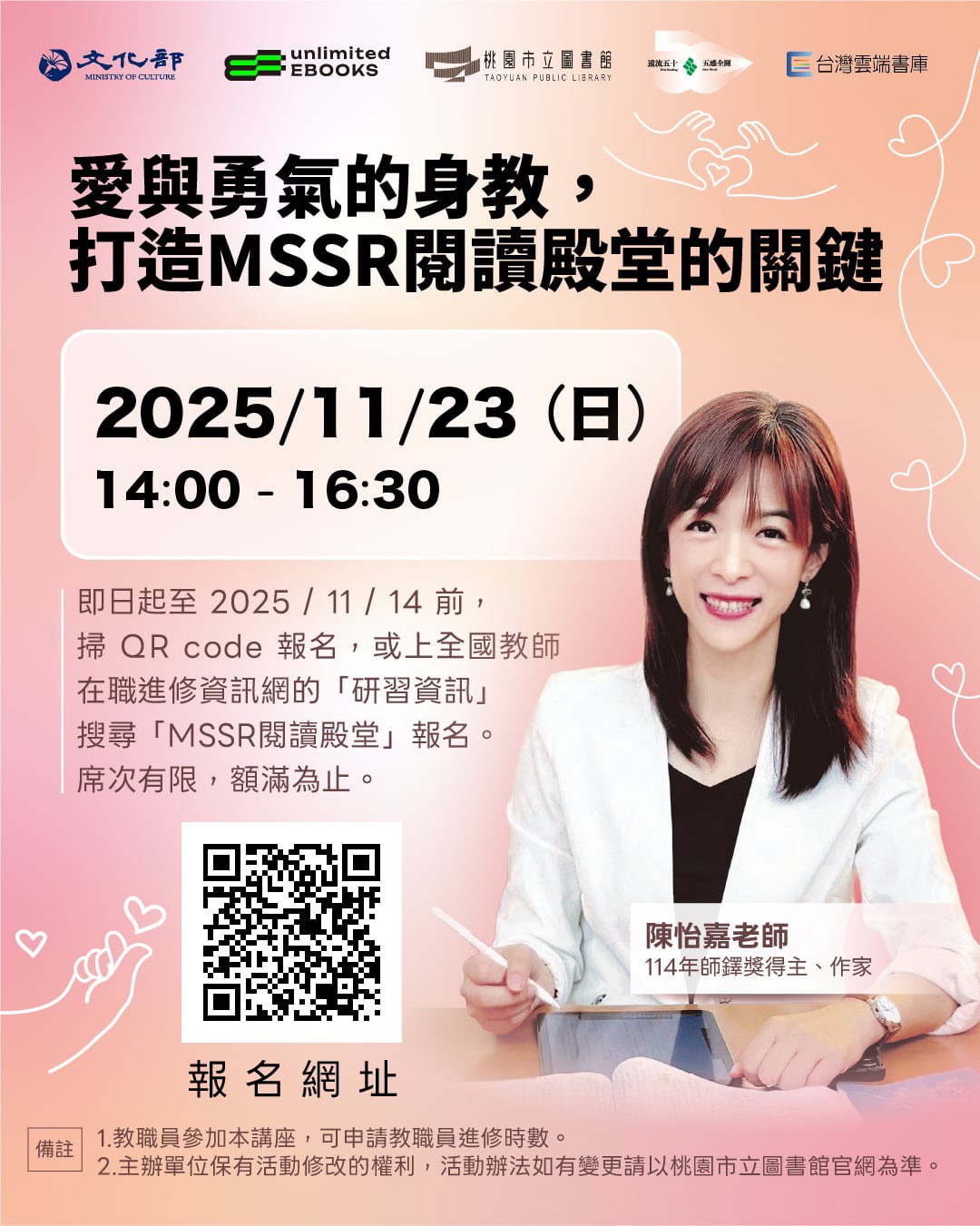 轉知桃園市立圖書館與遠流出版事業股份有限公司於1141123日舉辦「愛與勇氣的身教,打造MSSR閱讀殿堂的關鍵」講座,詳如說明: