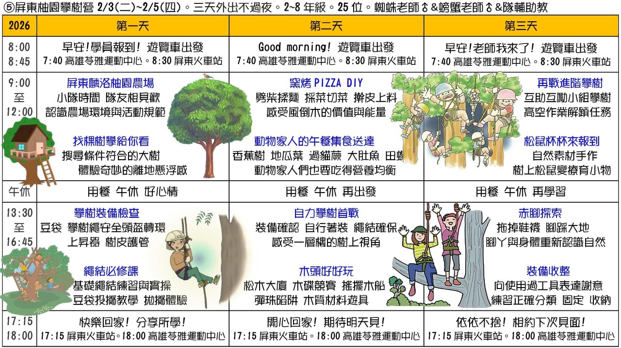 | 二、 | 課程主題:①蘭陽山野求生營(5天4夜)、②小琉球海龜營(5天4夜)、③宜蘭生態農場營(3天2夜)、④TPE博物館生態營(3天外出不過夜)、⑤屏東柚園攀樹營(3天外出不過夜)、⑥節肢小怪獸營(3天大學不過夜)、⑦池上單車生態營(4天3夜)。 |
