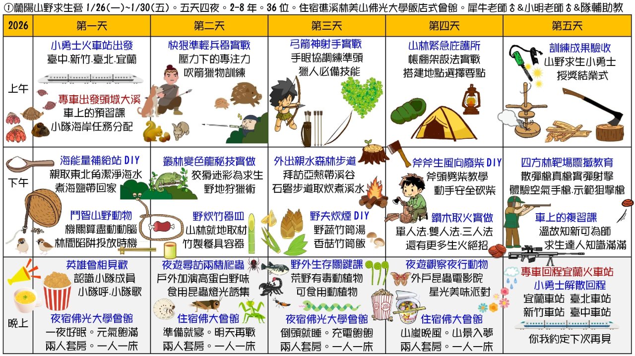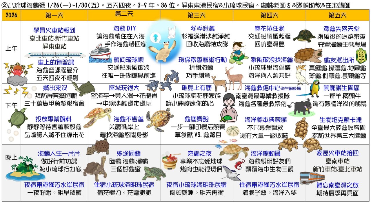二、 課程主題:①蘭陽山野求生營(5天4夜)、②小琉球海龜營(5天4夜)、③宜蘭生態農場營(3天2夜)、④TPE博物館生態營(3天外出不過夜)、⑤屏東柚園攀樹營(3天外出不過夜)、⑥節肢小怪獸營(3天大學不過夜)、⑦池上單車生態營(4天3夜)。
