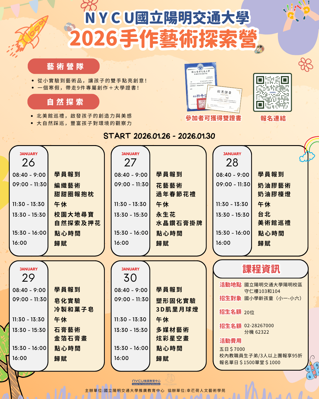 | 3、 | 鼓勵孩子們一同參與,3人以上團報5日課程,再享95折優惠:6,650元/人。 |