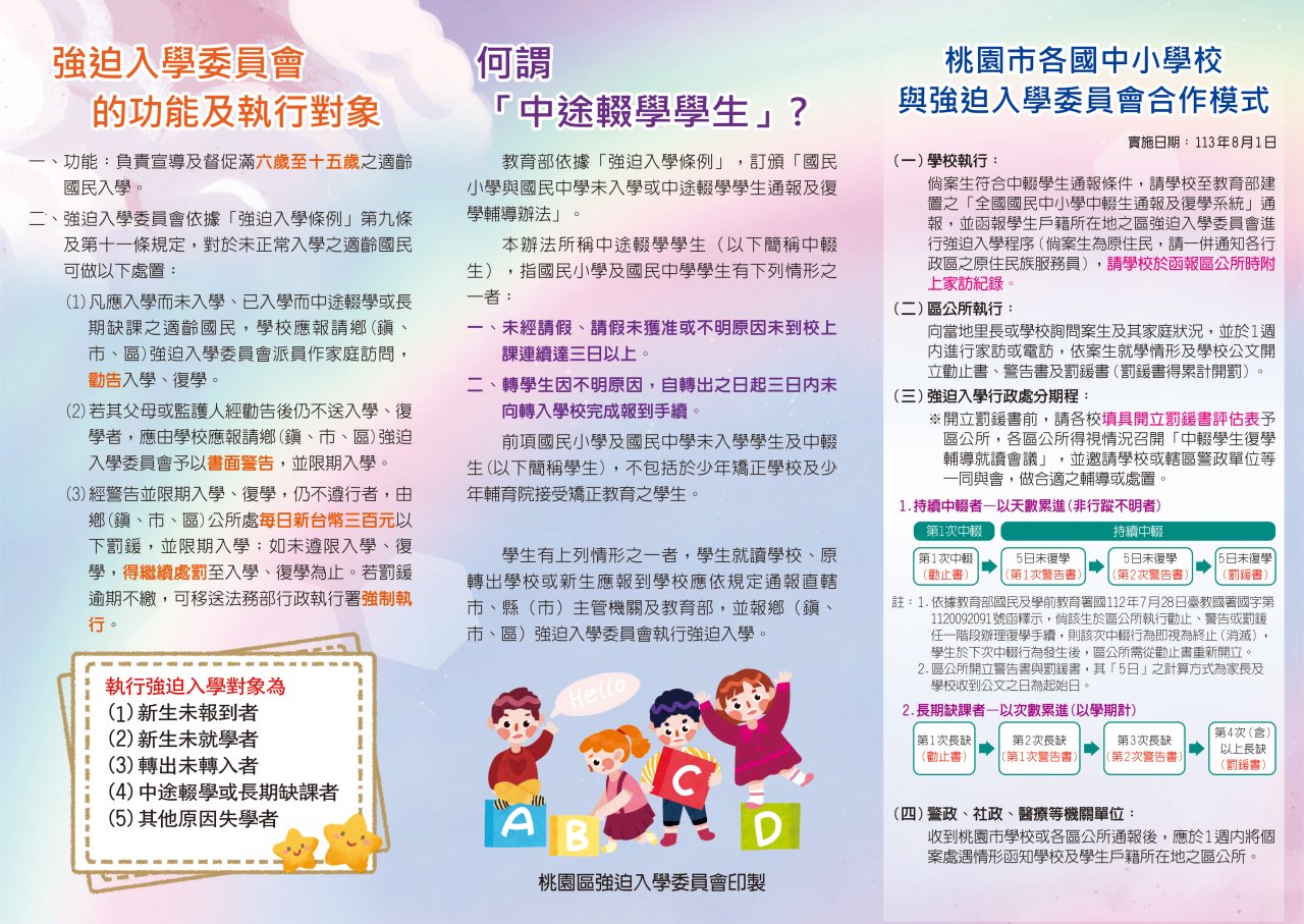 一、說明:檢附宣導DM,加強強迫入學宣導,請家長共同協助防制輟學。
