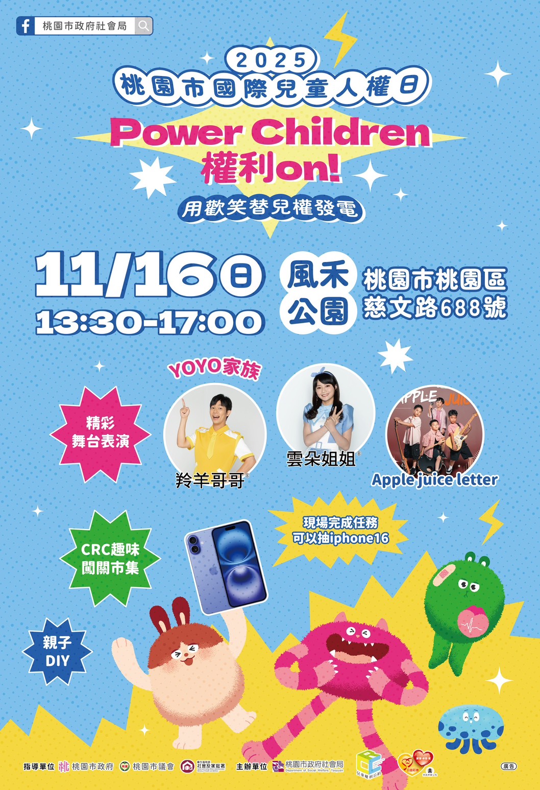| 一、 | 活動定於114年11月16日(星期日)下午1時30分至17時假風禾公園(桃園市桃園區慈文路688號)辦理。 |
