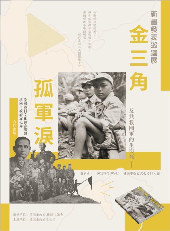 | 一、 | 由桃園市政府文化局與全國眷村文化保存聯盟共同出版的《金三角孤軍淚-反共救國軍的生與死》,聚焦38年國軍退守金三角的歷史,透過口述訪談與珍貴影像,真實呈現雲南反共救國軍在泰緬邊境三十年的奮戰歷程,歡迎有興趣的民眾至馬祖新村參觀「孤軍淚新書發表巡迴展」。 |