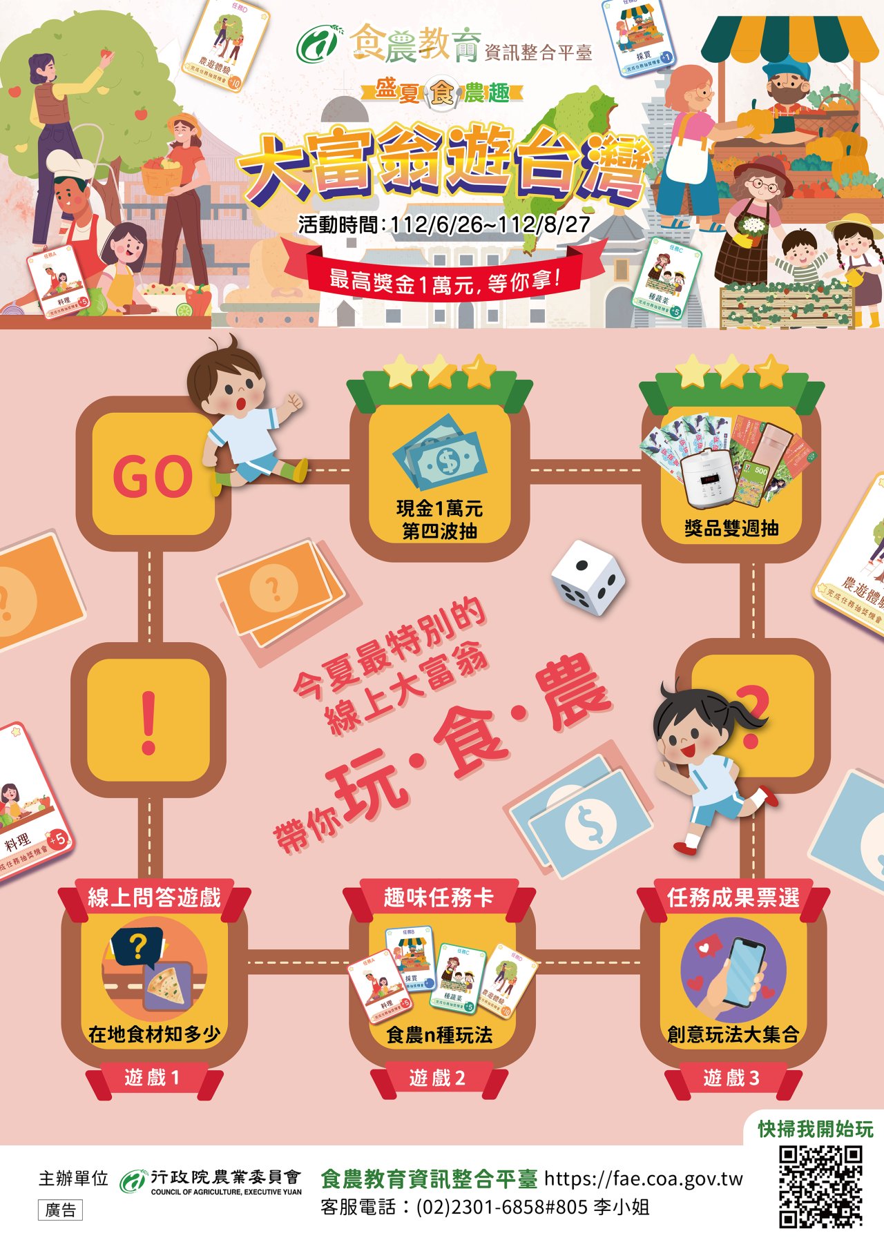 | 四、 | 為推播應用「臺灣農產地圖」單元內容,該會近期將舉辦「盛夏食農趣:大富翁遊臺灣」活動(網址:https://fae.coa.gov.tw/2023event/),總獎金超過10萬元,歡迎大家踴躍參加。 |