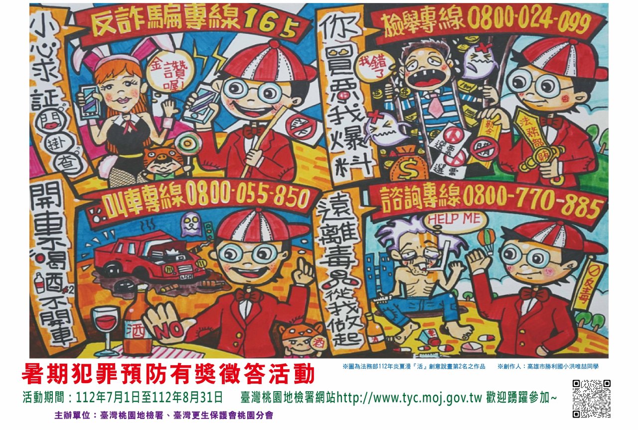 二、為預防青少年兒童於暑假期間因缺乏法治觀念思慮不周, 透過網路結交素行不良之人,進而從事不當休閒活動、涉 足不良場所或誤觸法網,導致落入犯罪情境,特於桃園地 檢署網站(http://www.tyc.moj.gov.tw)舉辦法律常識有獎徵答活動,增強青少年兒童之法治觀念以預防犯罪,鼓勵學生踴躍參加本活動。