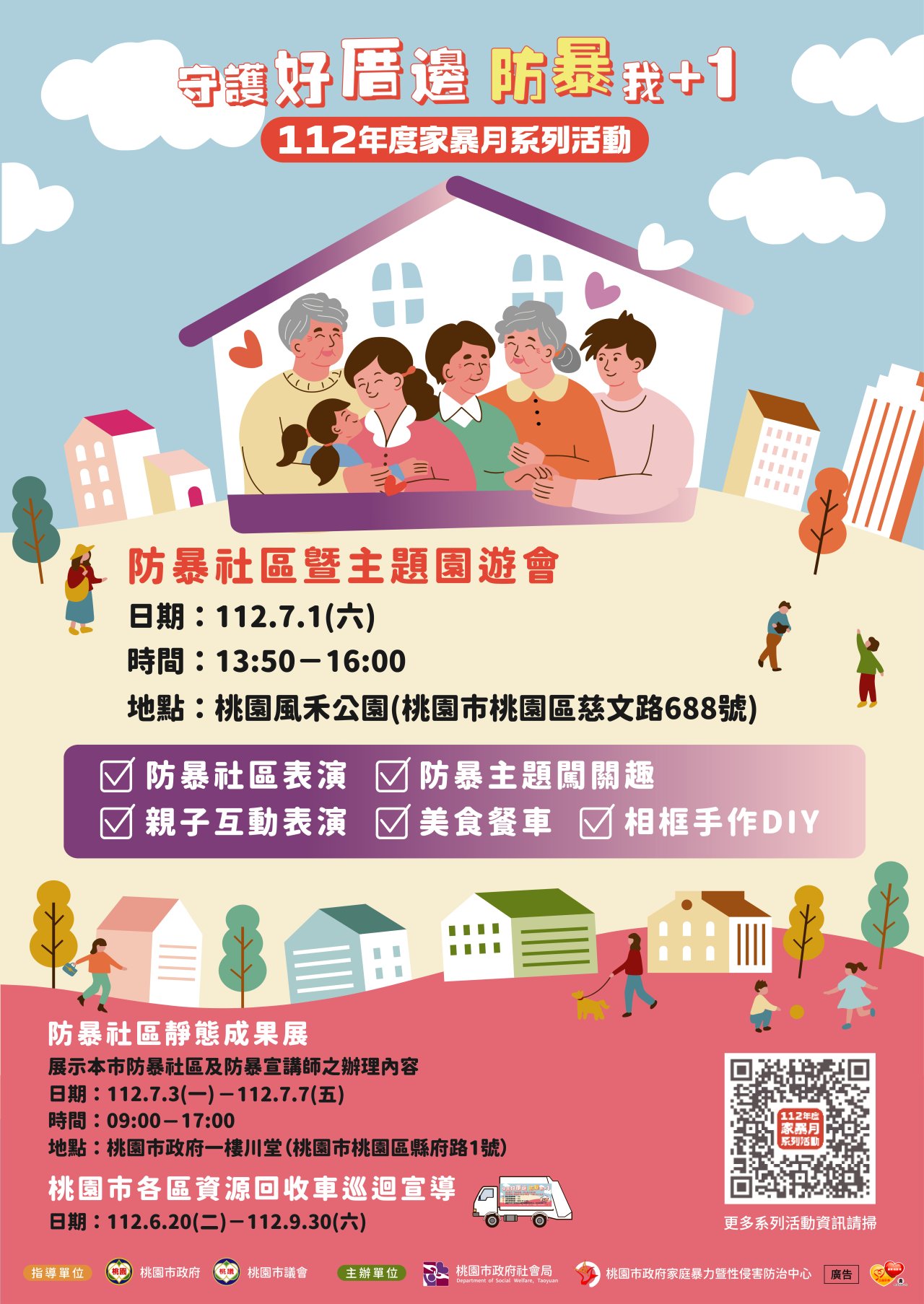 | 二、 | 旨揭系列活動主題為「防暴社區」,邀請本府相關單位、社福組織及在地協會於主題園遊會設攤宣導,當天亦有防暴社區靜態成果展及防暴社區形象影片播放,展現本市防暴社區的成果與能量並期待號召更多社區加入初級預防行列。 |