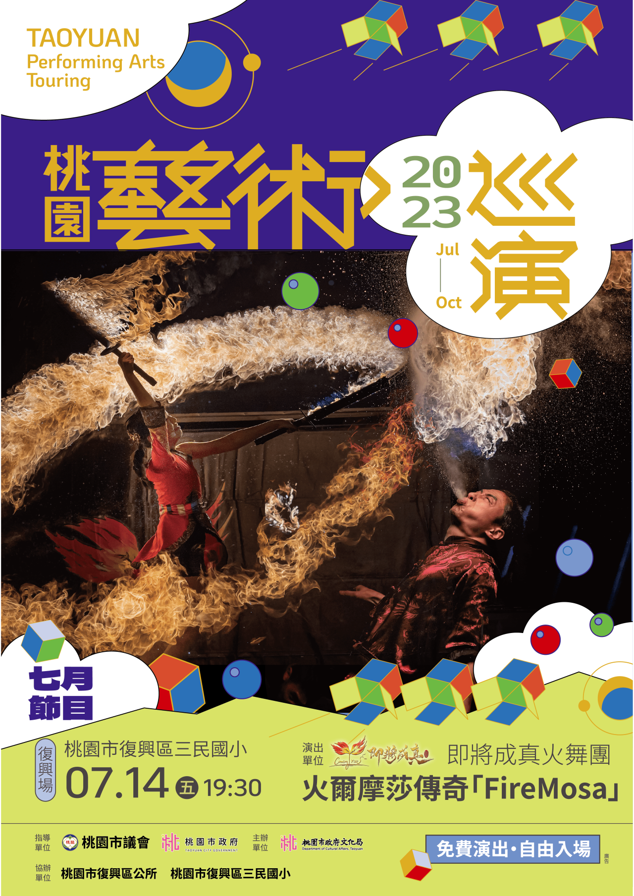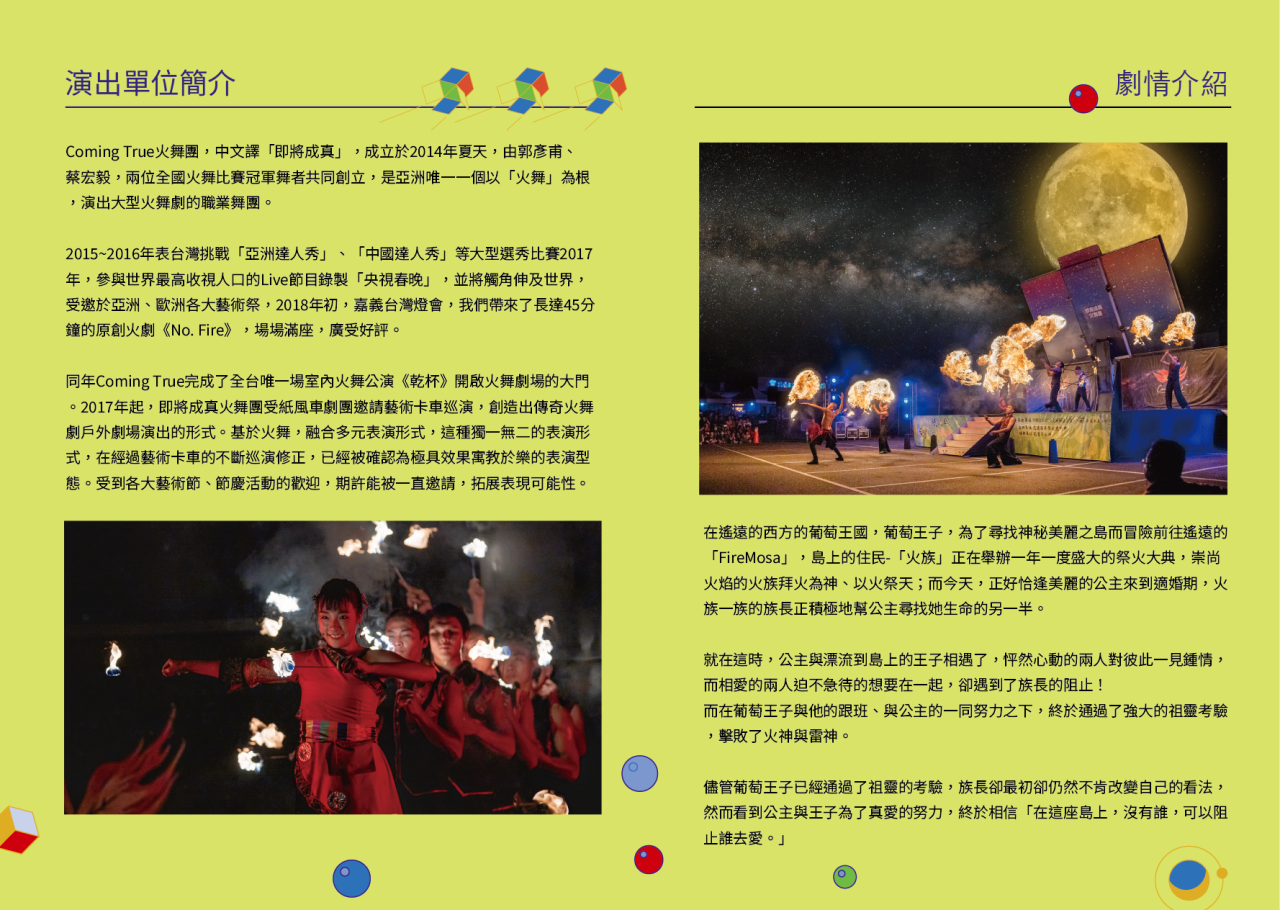 壹、主旨:2023桃園藝術巡演-即將成真火舞團 《火爾摩莎傳奇「FireMosa」》」活動。